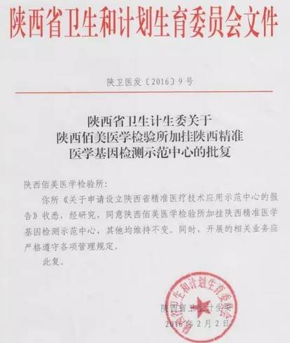 陕西精准医学基因检测示范中心获陕西省卫计委批复成立。批复文件表示:经研究,同意陕西佰美医学检验所加挂陕西精准医学基因检测示范中心,其他均维持不变。据悉,该中心的示范项目与研究方向,将在精准医学范畴内,全面提高陕西省预防、诊断、治疗先天与重大疾病的技术能力,尤其将显著改善癌症患者的诊疗体验和诊疗效果。