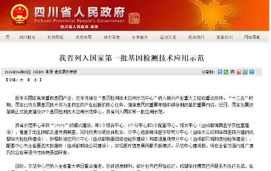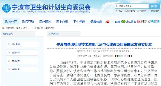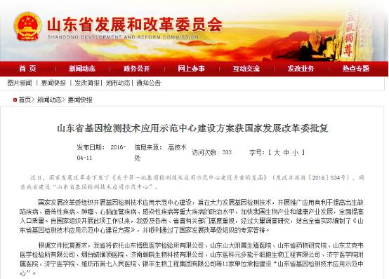 山东省发改委网站截图 山东省将依托山东博奥医学检验所有限公司、山东山大附属生殖医院、山东省药物研究院、山东艾克韦医学检验所有限公司、烟台毓璜顶医院、济南朝晓生物科技有限公司、山东医科元多能干细胞生物工程有限公司、济宁医学院附属医院、济宁医学院、潍坊市第七人民医院、银丰生物工程集团有限公司等11家单位承担建设“山东省基因检测技术应用示范中心”。 4宁夏4月12日,记者从宁医大总院了解到,近日“宁夏基因检测技术应用示范中心”获得国家发改委批复,是第一批国家基因检测技术应用示范中心之一。目前该项目已完成初期设计方案,将于2016年6月开工建设,预计2018年3月正式投入使用。 该中心位于银川综合保税区宁夏生物科技信息产业园内,建筑面积16218平方米。由宁夏医科大学总医院申报完成建设。建成后主要开展肿瘤、单基因遗传病、心脑血管和感染性疾病的临床基因检测技术应用,个体化医学分子诊断项目研发、试剂开发及产业化应用推广等工作。该项目的建设将在宁夏区内完成遗传性耳聋和唐氏综合征等遗传性疾病基因筛查工作,惠及人员3000万人,预计实现临床诊断15万人次/年。